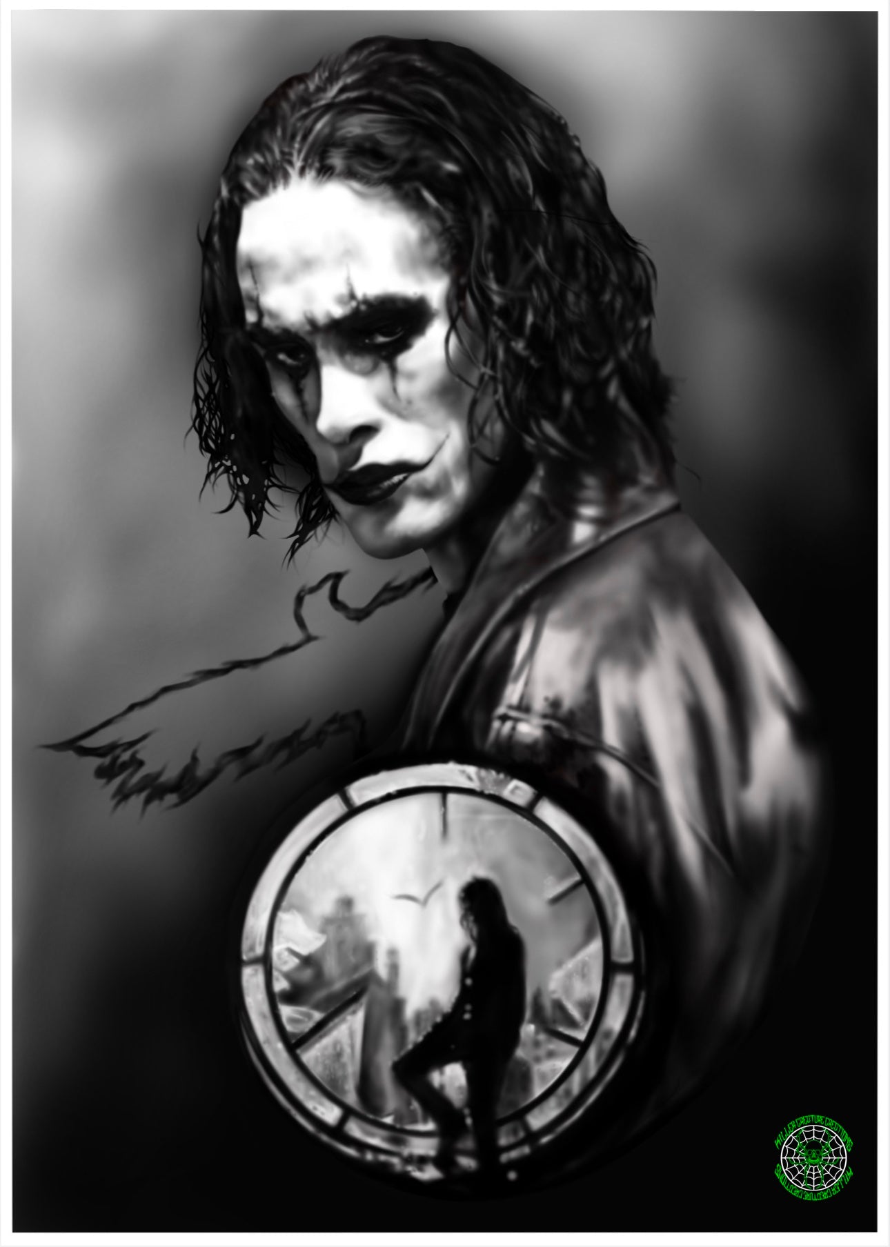 A4 black and grey Print (250gsm, Gloss front lamination, no back printing) of the THE CROW fully digitally drawn design by myself (Killer Creature Creations).